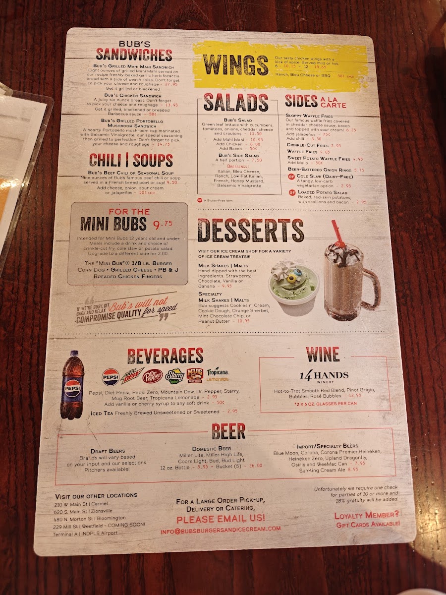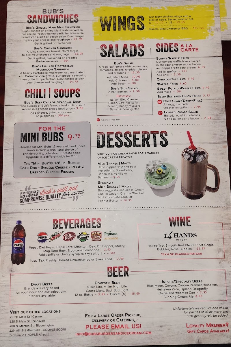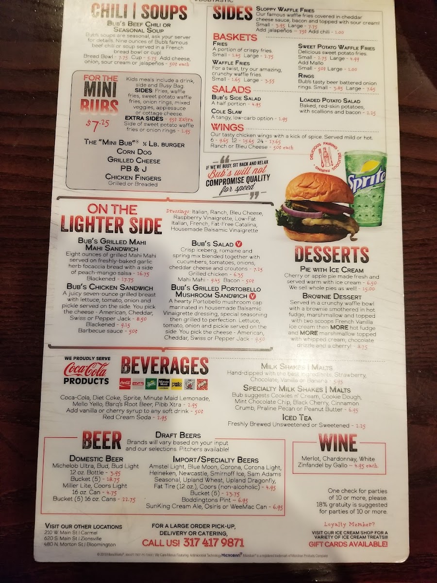 Intended for Mini Bubs 12 years old and under. Meals include a drink and choice of crinkle-cut fry, applesauce, cottage cheese, cole slaw or potato salad. Upgrade to a different side for $2.50