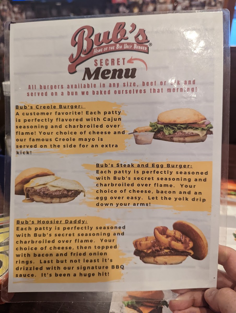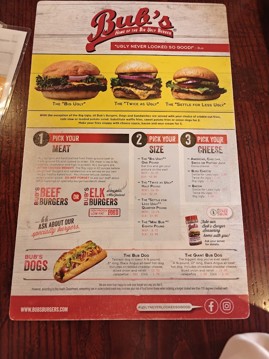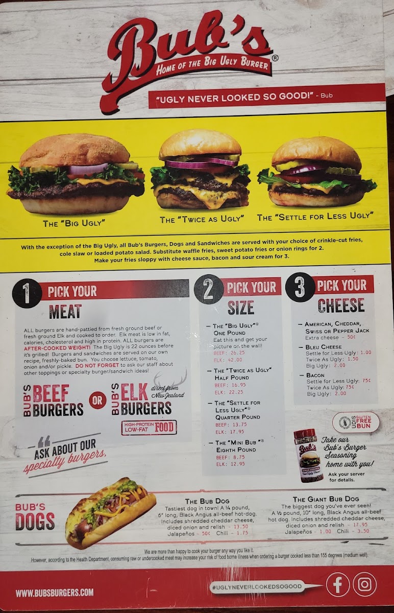 Bub's “Big Ugly”® ONE POUND burger has been featured on Man vs Food! If dining in, eat all of it and get your picture on the wall! Created for those with a BUB appetite! Bub's Big Ugly Burger is 22oz/10" in diameter before cooked and 16oz/7" in diameter after cooked based on medium-well cook. AND the bun is 1/2lb that we baked ourselves that morning! Bub's Burgers are made from beef or elk that's hand-pattied and perfectly seasoned with Bub's secret seasoning then charbroiled over flame!