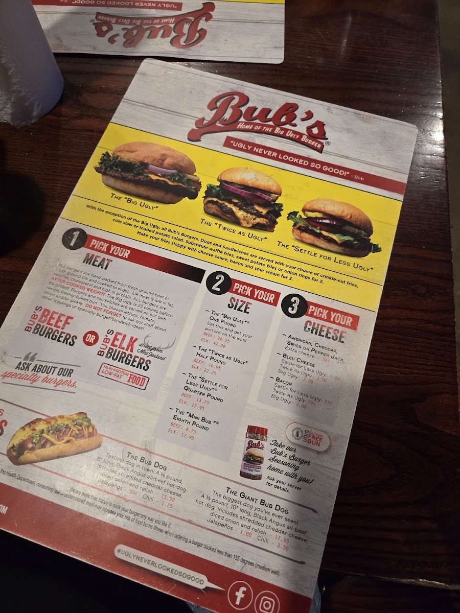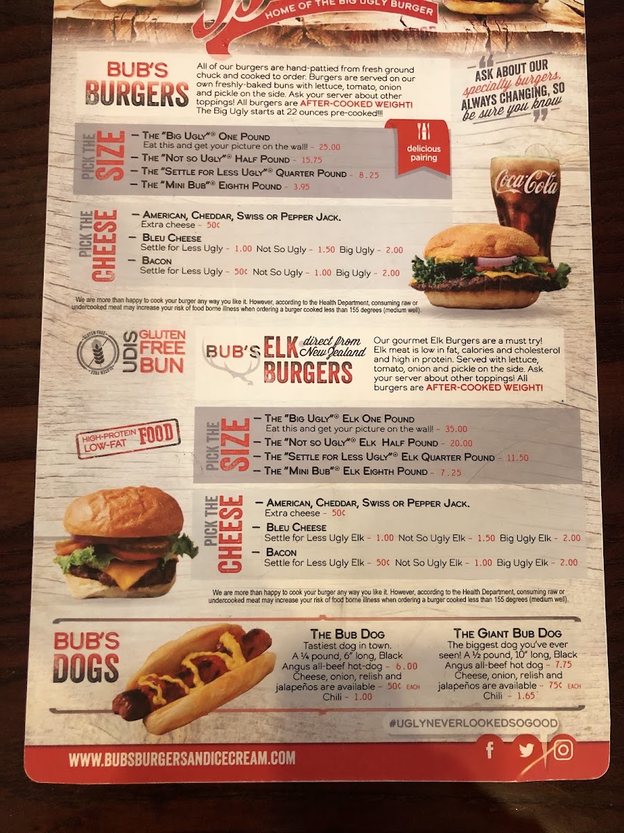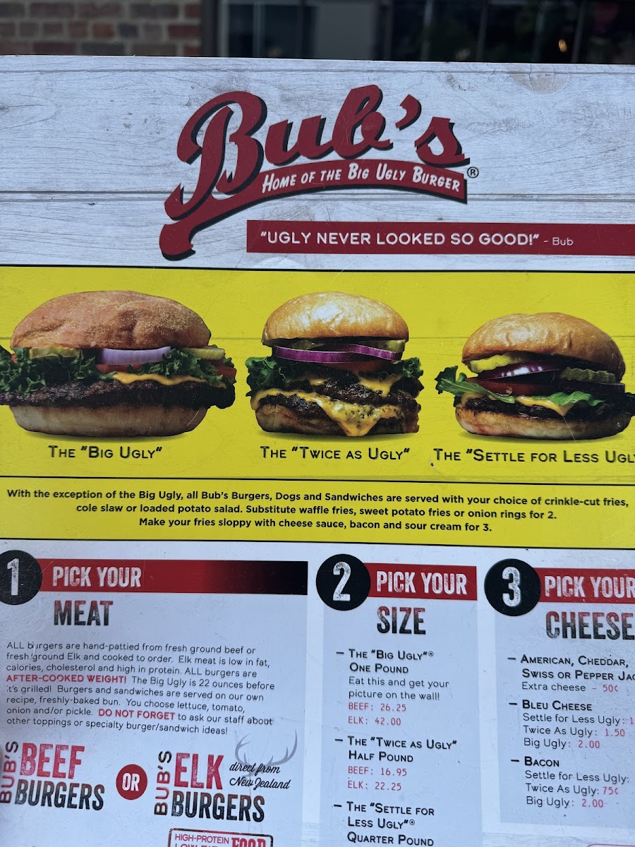 The Big Ugly Elk Burger is ONE POUND after cooked! 100% ground elk from New Zealand that is perfectly seasoned with Bub's secret seasoning then charbroiled over flame. Don't forget we bake our own buns every morning!